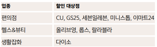할인 대상처 중, '편의점'은 CU, G25, 세븐일레븐, 미니스톱, 이마트24로 구성되어 있으며, '헬스&뷰티'는 올리브영, 랄라블라, 롭스, '생활잡화'는 다이소로 구성되어 있습니다.