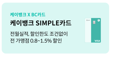 케이뱅크 SIMPLE카드는 케이뱅크와 BC카드가 제휴해 만든 신용카드로, 명칭과 같이 혜택이 정말 심플하게 되어 있습니다.
