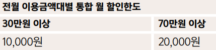 전월 실적 30만원 이상이면, 생활 필수영역 통합 '월 최대 1만원', 전월 70만원 이상이면, 생활 필수영역 통합 '월 최대 2만원'까지 할인받을 수 있습니다.
