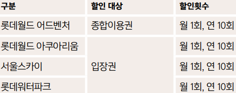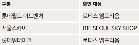 - 대상 : 롯데월드 어드벤처, 아쿠아리움, 서울 스카이, 롯데 워터파크