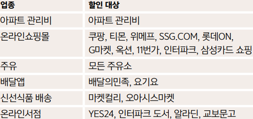 - 아파트 관리비, 온라인몰, 주유, 배달앱, 신선식품 배송, 온라인 서점