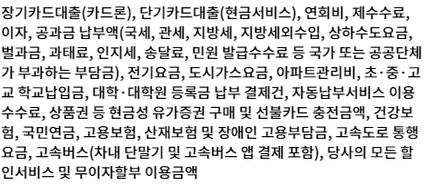 | 공과금 (전기/도시가스/수도 등), 각종 세금, 아파트관리비, 4대 보험료, 무이자할부, 초중고 납입금, 대학(원) 등록금, 벌과금/과태료, 상품권 구매, 선불카드 충전, 현대카드의 다른 할인 (이벤트 등)이 적용된 건 등은 실적 제외 |