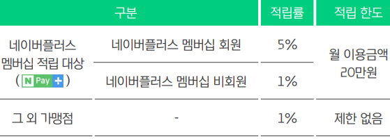 네이버 멤버십 적립 대상이 아닌, 국내외 모든 가맹점 (= 즉, 일반 가맹점)에서는 별도 한도 제한 없이, 언제나 1% 적립됩니다.
