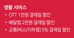 '생활 할인 혜택'은 총 3가지로, OTT (넷플릭스, 유튜브) 1천원 할인, 배달앱 (배민, 요기요, 쿠팡이츠) 2천원 할인, 대중교통 5% 할인으로 구성돼 있음