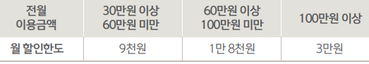 전월 실적 30만원 이상이면, '월 최대 9천원까지', 전월 60만원 이상이면, '월 최대 1만 8천원까지', 전월 100만원 이상시, '월 최대 3만원까지' 할인받을 수 있습니다 (일반결제, 기타결제 통합)
