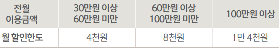 전월 실적 30만원 이상 시 통합 월 최대 4천원, 전월 60만원 이상 시 통합 월 최대 8천원, 전월 100만원 이상이면, 통합 월 최대 1만 4천원까지 할인받을 수 있습니다.