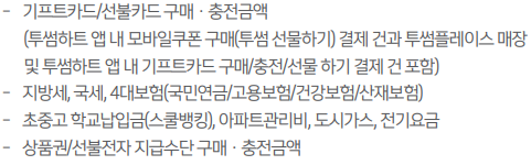 그 외 국세/지방세, 4대 보험, 초중고 납입금, 아파트 관리비, 도시가스, 전기요금, 상품권· 선불전자 지급수단 구매/충전 등이 실적에서 제외 (실적 제외 항목이 많은 편은 아님)