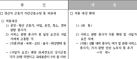 - 생산직 근로자 야간 근로수당 등 비과세 대상이 확대