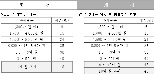 원래 과세표준 5억원 초과구간 (세율 42%)까지만 있었지만, 올해부터는 10억원 초과구간이 신설되었고 (세율 45% 적용), 이로 인해, 종전 5억원 초과 구간은→ 5억원 초과~10억원 이하 구간으로 범위가 넓어졌습니다.