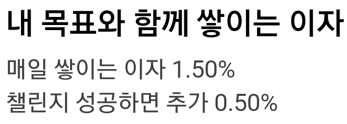 목표일 (만기) 때까지 '목표금액'을 모아가는 데, 중점을 둔 상품이며, 기본금리 연 1.5%에 목표일까지 자동 모으기 (=자동이체)을 통해, 챌린지를 성공하면, 우대금리 연 0.5%P가 더해져, 최고 금리는 연 2% (세전)가 됩니다.