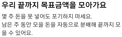 | 매주 '모으기 금액'은 목표일 (만기) 때 받는 원금과+ (세후)이자의 합계금액과 목표금액이 일치하도록 계산 됨 (원 단위 미만 절사) |
