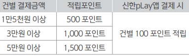 위의 추가적립 '대상 가맹점'에서 건별 '결제한 금액'에 따라, 적립되는 포인트가 달라지며, 신한 플레이앱으로 결제한 경우는 건별 100점이 추가