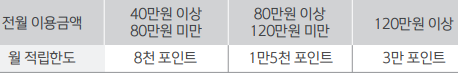 전월 결제실적 40만원 이상이면, 월 최대 8천점, 전월 80만원 이상, 월 최대 1만 5천점, 전월 120만원 이상, 월 최대 3만점까지 기본적립 가능합니다.