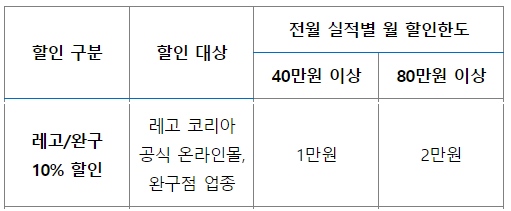 ※ 공통적으로, 레고랜드 할인 혜택의 '월 할인한도'가 꽤 넉넉한 편