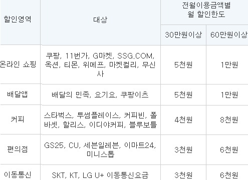 5대 업종을 전부 통합한 한도를 보면, 전월 30만원 이상이면, '월 최대 2만원'까지, 전월 60만원 이상이면, '월 최대 4만원'까지 할인 가능합니다.