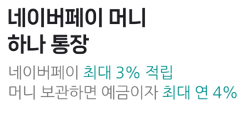 | ① 네이버페이 (=N페이) 머니 통장에 보관된 금액은 일별 최종잔액 '100만원' 한도 내에서 최대 연 4% (세전) 이자를 받을 수 있으며 (한도가 크지 않음), ② 해당 통장에 보관된 N페이 머니로 N페이 가맹점에서 결제시 최대 3% 적립이 되고 ③ 통장에 가입하면 누구나 조건 없이, 하나은행 수수료 면제를 받을 수 있습니다. |