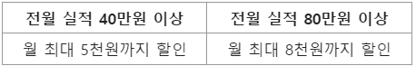 1. 모든 영역은 '전월 40만 이상'과 '전월 80만 이상'- 둘로 구분해, 월 할인한도가 달라짐