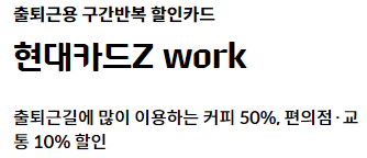 ① 현대카드Z Work는 '출퇴근하는 직장인'에 맞춰, 커피, 교통, 편의점, 통신비 할인 등으로 구성되어 있고, 특히 커피 할인이 다른 혜택보다 큼