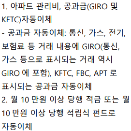 | 1. 대량 급여이체 (101코드) : 지로, 펌뱅킹, 공동망 등 대량 급여이체 방식을 통해 입금된 급여 - 대량이체가 아니거나 '급여'가 아닌 '일반'코드로 입금되는 이체건 제외 2. 건별 급여이체 (103코드) : ①번 또는 ②번 중, 하나에 해당하면 됨 - '급여계좌 설정' 및 '급여 이체일'을 지정해야 하며, 건별 급여이체의 경우, 이체금액이 70만원 이상이어야 함 ① 적요란 및 입금자란에 '급여', '월급', '봉급', '상여금', 보너스' 문구 중, 하나로 온라인 거래나 창구 단말로 급여이체 - 당행 내 동일인 계좌간 이체는 제외되며, 현금/대체 구분 없음 ② 급여 이체일 지정 후, 지정일 전/후 1영업일 이내에 급여이체 |