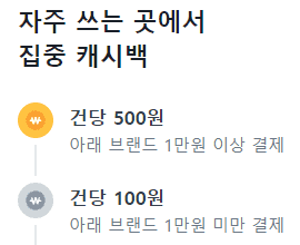 각 '영역별' 정해진 대상처에서 '건당 1만원 이상' 결제할 때는 500원 캐시백, '건당 1만원 미만' 결제할 때는 100원 캐시백을 받을 수 있습니다.