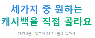 '이벤트 캐시백'은 9월 1일~11월 30일까지는 행운 캐시백 혜택을 제공하며, 12월 1일~1월 말까지는 다른 혜택으로 변경되는 것 같습니다 (※ 추후 공지 참고)