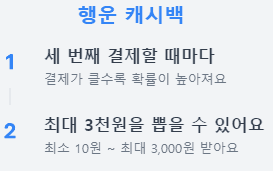 ③ 행운 캐시백은 매 3번째 결제할 때마다, 행운뽑기 기회가 1회 주어지며, 1회당 최소 10원~최대 3천원까지 랜덤 당첨