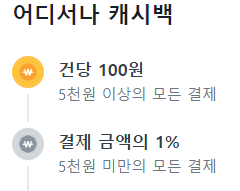 국내 가맹점에서 건당 '5천원 이상' 결제 시 건당 100원, 건당 '5천원 미만' 결제시 1% 캐시백