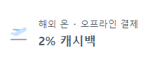 | 1. 해외 결제 : 2% 캐시백 - 대상 : 해외 온/오프라인 전 가맹점 - 별도의 한도 제한 없음 2. 해외 ATM 출금 수수료 면제 |